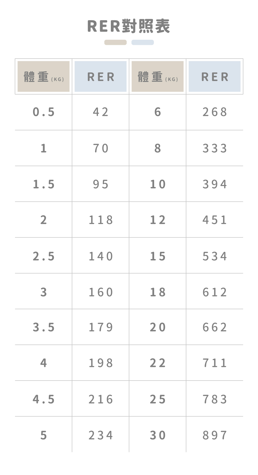 RER:是毛孩休息狀態熱量需求,跟我們的常聽到的基礎代謝量是相同的意思,是維持身體基本運作的熱量。