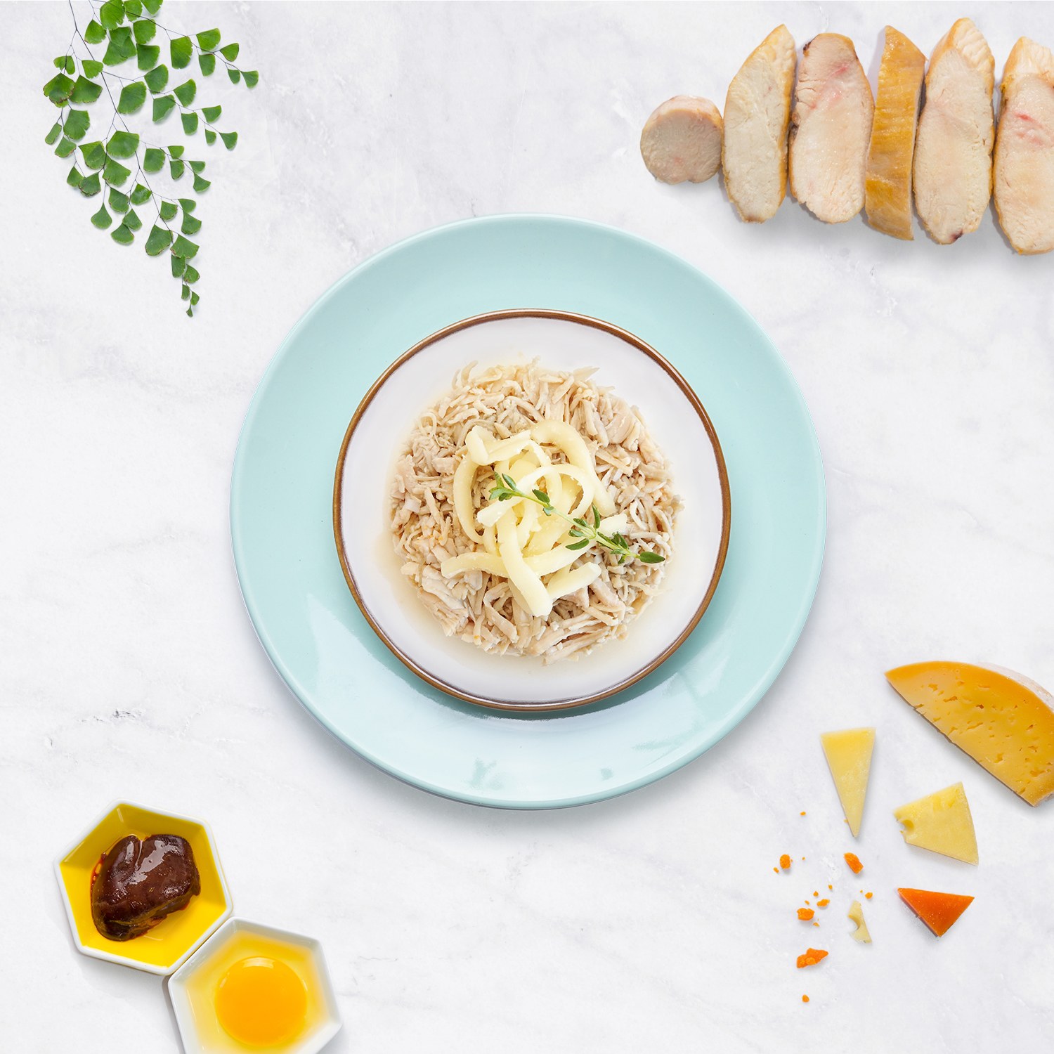 雞肉、高湯、起司、雞肝、葵花油、蛋、硫酸鈣、磷酸鈣、酸式焦磷酸鈉、礦物質(氧化鋅、鐵、亞硒酸鈉、 一水硫酸錳、銅胺基酸複合物、碘化鉀)、氯化膽鹼、鹽、維生素(維生素E、維生素 B1、維生素B3、維生素A、維生素B6、維生素B5、維生素B2、葉酸、維生素B12、維生素D3、維生素B7)、牛磺酸