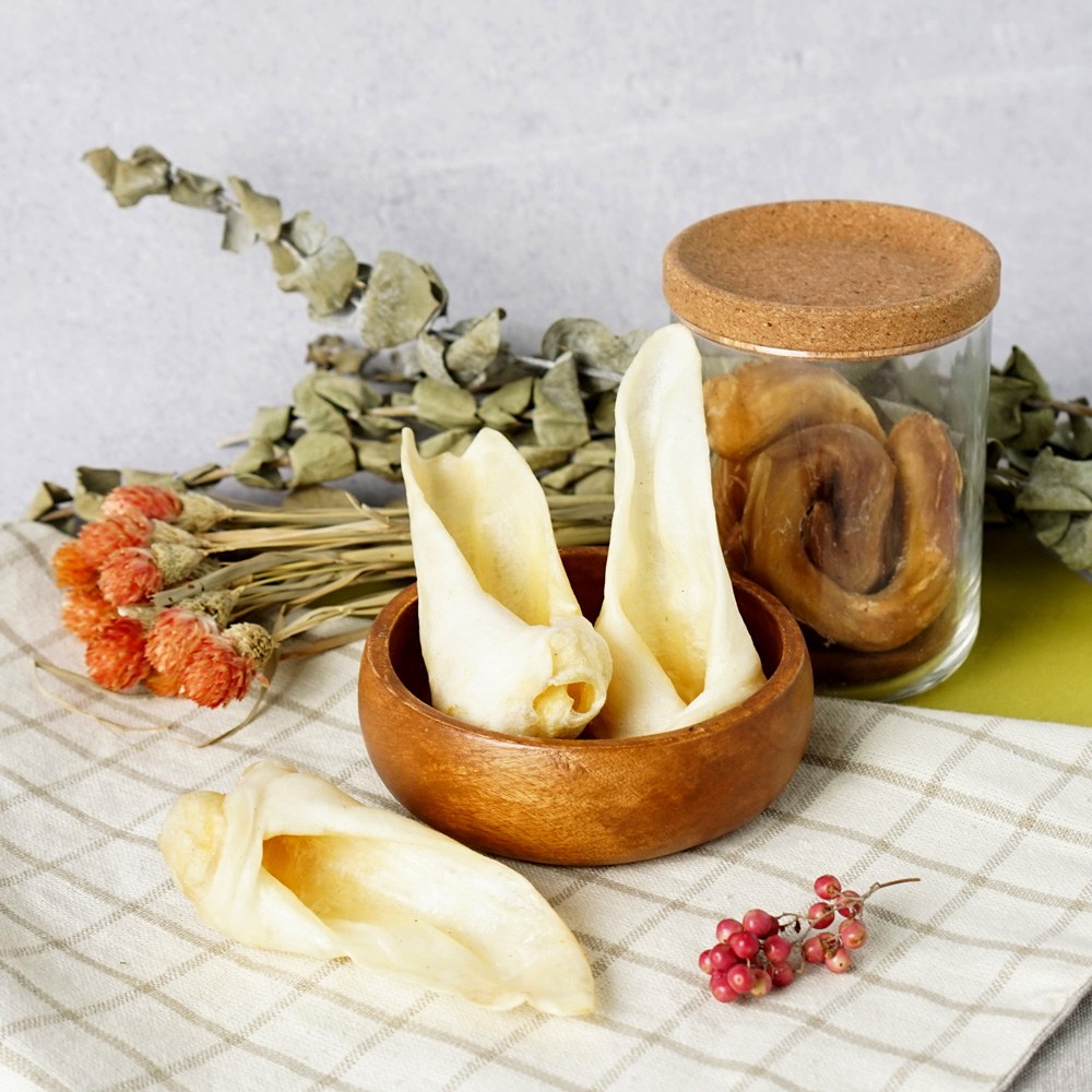 低溫風乾技術製作,保留食物原味營養;羊耳富含膠質與天然油脂,帶有淡淡的羊油味,保養皮膚水噹噹,啃咬吸收水分後會變Q韌。