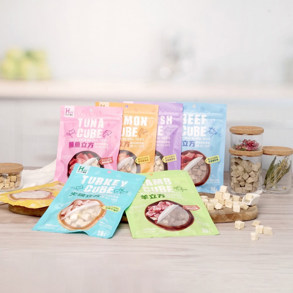 立方零食是比擬人類製成用心的製作,狗狗貓貓都可以吃,每1顆=1公分立方,小SIZE好入口,推薦給小狗狗跟貓咪或是牙口不好的犬貓食用。